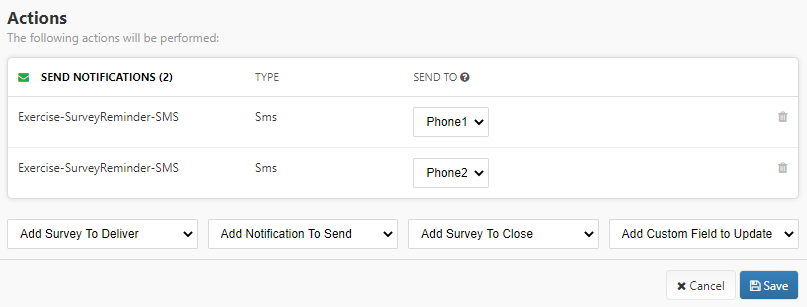 There may be instances where you need to send an SMS notification to multiple phone numbers, or an email notification to multiple email addresses. To accomplish this, first you need to create custom fields with a data type of phone or email. Once the custom fields are defined, you can add the notification under the schedule actions as many times as necessary and select which custom fields to use.