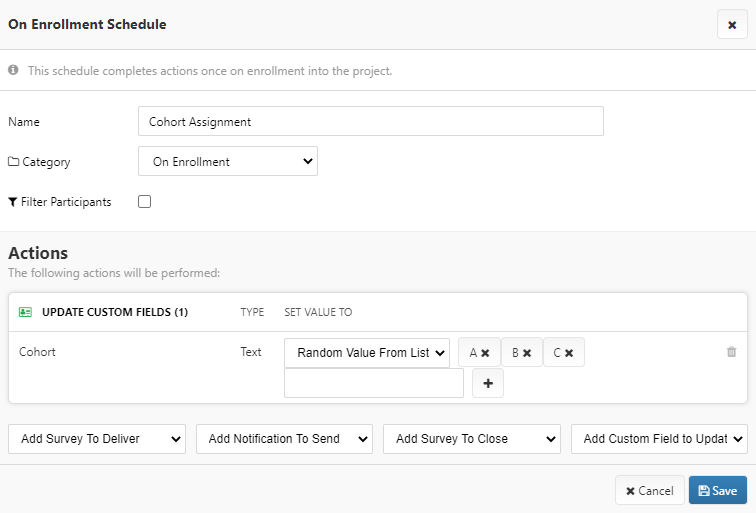 The example schedule below randomly assigns each participant to either cohort A, B, or C on enrollment.