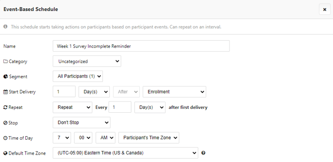 To begin, we will create a schedule Based on Participant Events, where the event is set to Enrollment. We will set the trigger logic to run 1 day after Enrollment and repeat every 1 day so that all applicable participants will receive this notification.