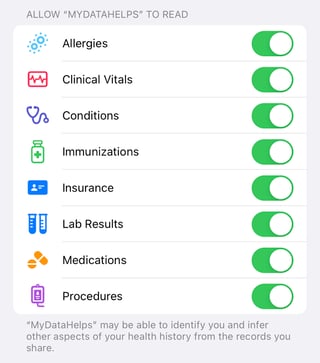 Only the selected clinical data will be made available to MyDataHelps. MyDataHelps does not collect full medical records.