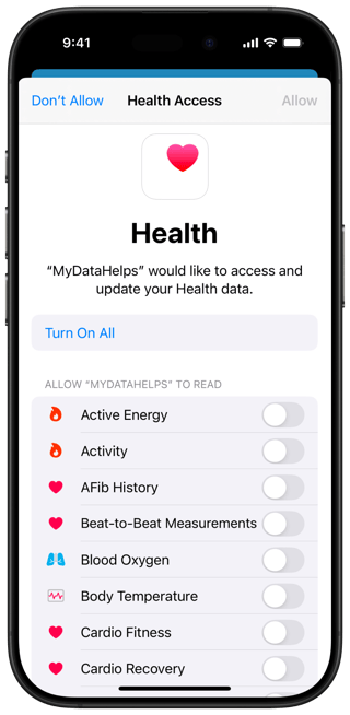 On iOS devices, MyDataHelps can collect data from Apple Health. Apple Health supports a number of different data types: activity, vital signs, sleep analysis, body measurements, clinical records, nutrition, and more.