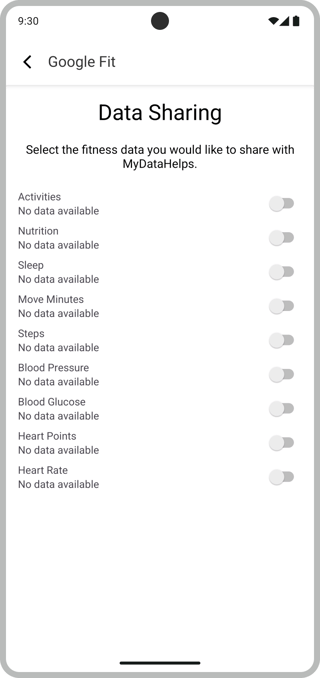 When the participant enrolls in the project in the MyDataHelps Android app, the app will ask them which sensor data they want to share. They can elect to share some, all, or none of the requested data. The participant will also be prompted to select which account they wish to use. Once the participant has elected to share their data, Google Fit will attempt to collect data for the last 30 days. After this, Google Fit will send new data to MyDataHelps several times per day.