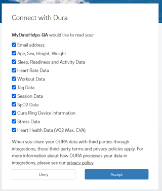 The participant will be prompted to log in to their Oura account and select what data types they wish to share before agreeing to connect.