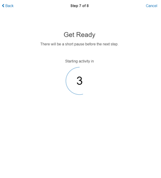 Step Type: Countdown A countdown step prompts the participant to wait a set period of time before allowing them to continue. Typically this is used to give the user a chance to prepare for a timed or fast-moving task.