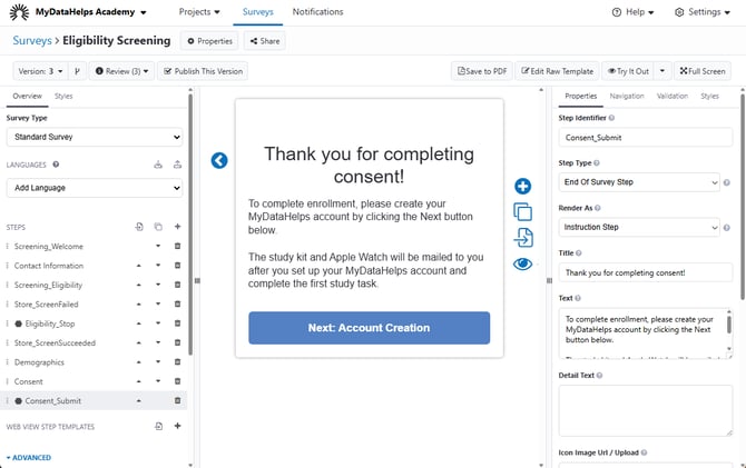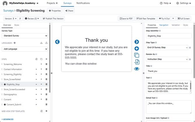 The End of Survey step allows you to display information to the participant at the end of their survey, after their results have been submitted. This can be especially useful for surveys completed via web, to ensure that survey results are saved before the participant exits out of the browser.