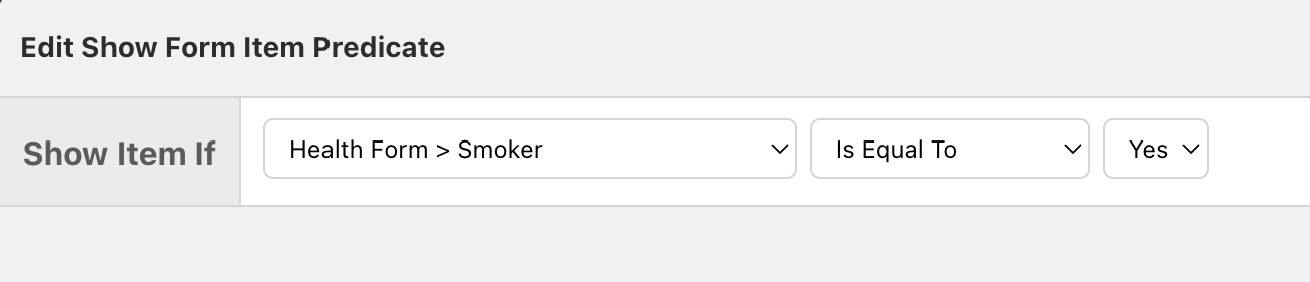 - Select a condition and value from the drop-down menu. This example will show the current form item if the participant answers 'yes' to a previous form item asking if they're a smoker.