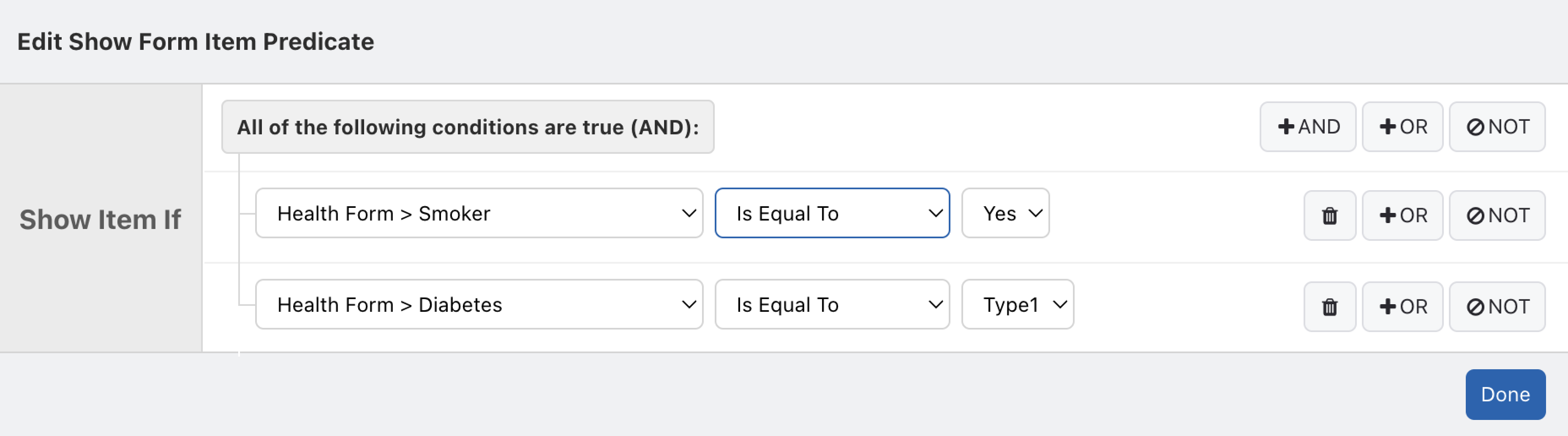 - You may use the "AND," "OR," and "NOT" buttons to create more complex conditions. This example will show the current form item if the participant reported to be a smoker AND has Type 1 Diabetes.