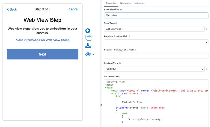 The web view step allows for embedding any HTML, CSS, or JavaScript inside a survey. It allows for extreme flexibility in creating custom experiences, but requires the user to be able to code in HTML, CSS, and JavaScript.
