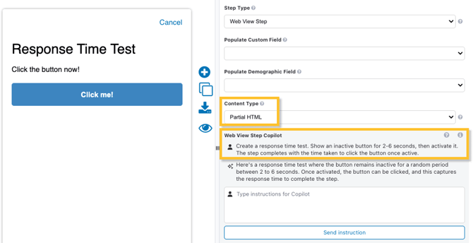 In most scenarios, it is recommended to use the Partial HTML content type with your Standard Survey V2 since it loads your survey's Look & Feel settings. Additionally, an optional Web View Step Copilot is available, which uses AI to help you generate code for your Web View step. Here are a few tips on using the copilot:
