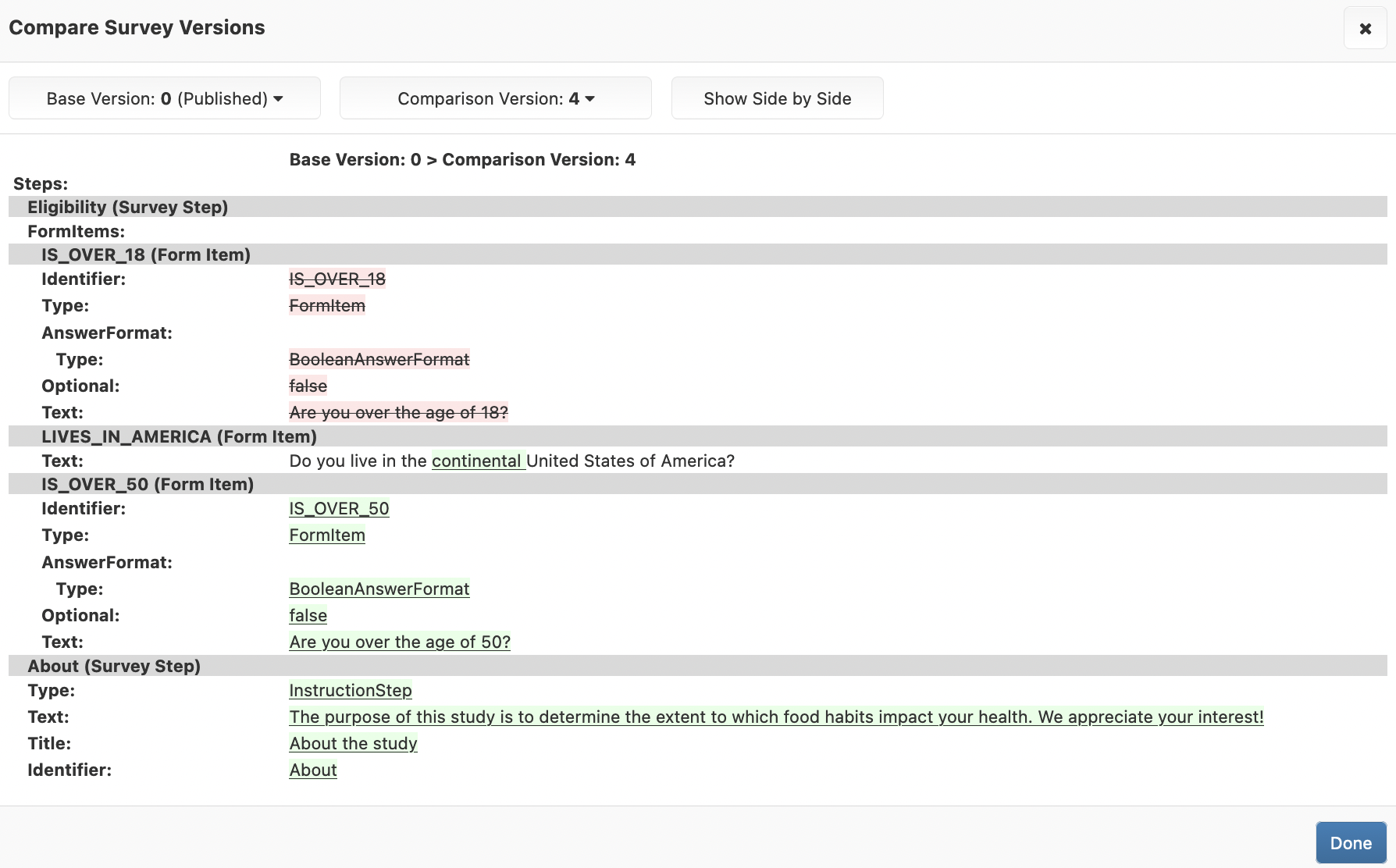 As you create additional versions of your survey, you might find that you wish to compare and review the differences between versions. This might be useful if someone else made the edits or if you are looking to know when a change was introduced. To compare survey versions: