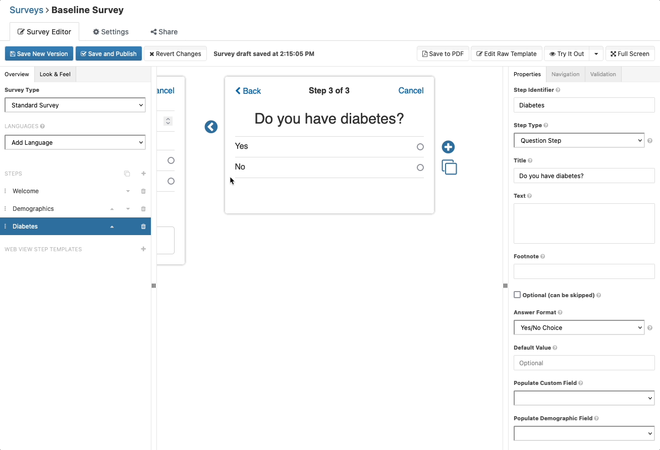 After you have updated a survey, you can save a new version of your survey via the "Save New Version" button at the top. You're encouraged to save frequently to avoid losing your work.
