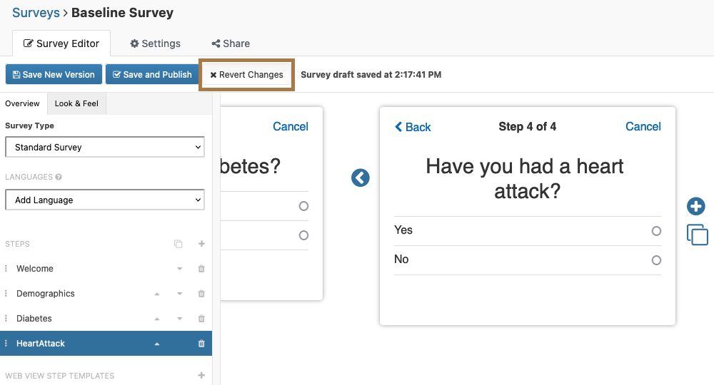 You can always revert to a previous version of the survey by clicking on the version drop-down.