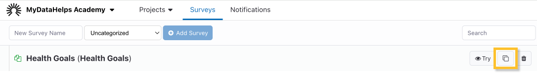 To copy a survey, navigate to the Surveys tab and select the copy button. Only the most recent version is copied to the new survey.