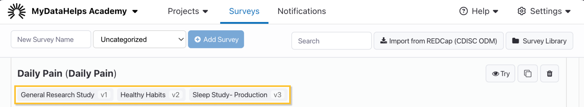 Surveys support version control, which allows you to track, compare, and even revert changes. Once a survey has been published to a project, a tag on the Surveys tab will indicate the project name and version published to that project. Note that different versions of a survey can be published to different projects.