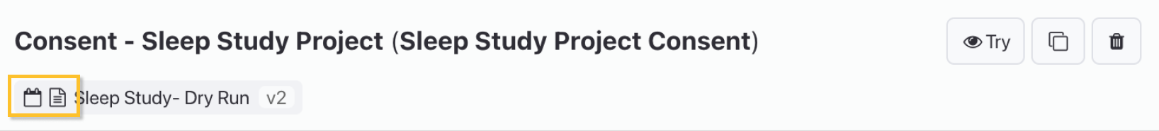 Surveys which are scheduled for a particular project include a "calendar" icon, and surveys set as the Enrollment Survey will show a "document" icon.