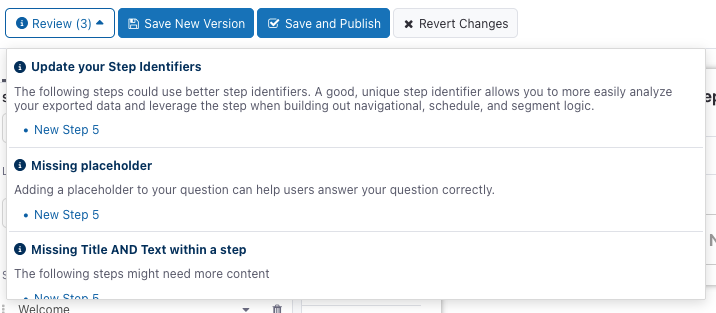As you configure your survey and are ready to save and or publish a new version, you may be prompted with a Review button.