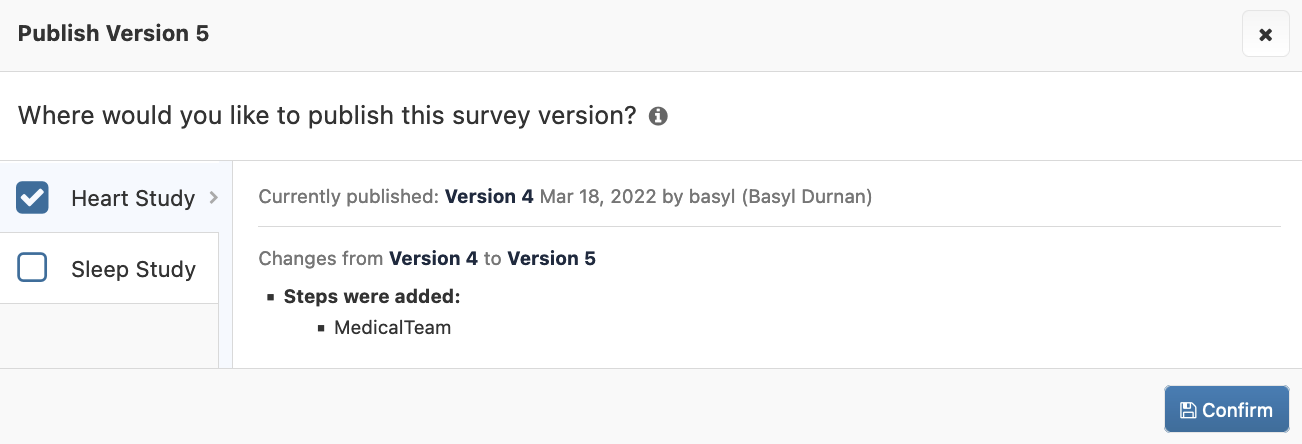 When you go to publish a survey, a pop-up window will outline changes made from the currently published version to the new version. If you have multiple projects, you can choose which projects you'd like to publish the current version to by clicking the checkbox next to the project's name.