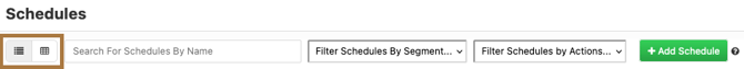 To toggle between the views, click the view type buttons on the top left of the “Schedules" tab. Both views can be filtered by schedule category, segment, and action.
