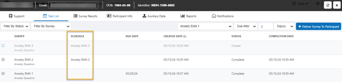 You may also view schedules in the Tasks tab of Participant Info, as described in the Viewing and Closing Survey Tasks article.