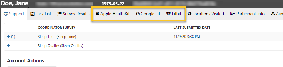 - Select the appropriate sensor data tab: Apple HealthKit, Locations Visited (for Apple Location Tracking), Google Fit, or Fitbit. (The specific tabs available will vary depending on your project's sensor data settings.)