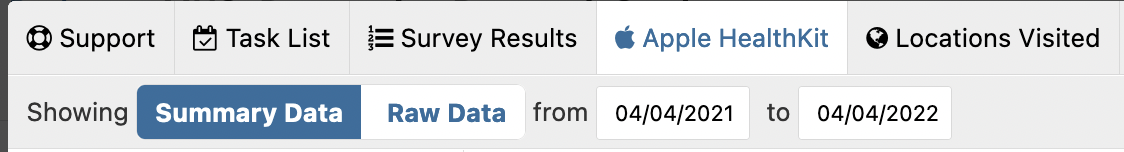 Additionally, HealthKit data can be viewed as "Summary Data" (default) or "Raw Data" (helpful for looking at specific JSON datapoint information).